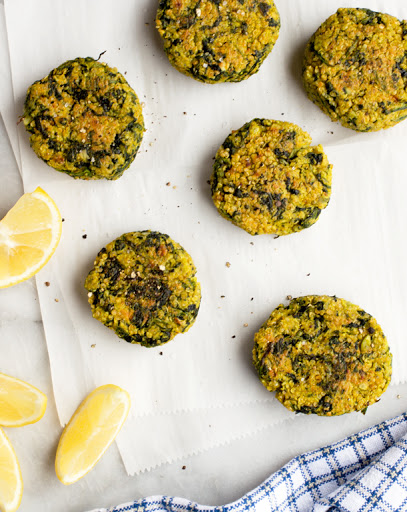Stir in the next 8 ingredients (quinoa through pepper). Stir in the egg whites until well combined. Form into 12 patties and place on a parchment-lined baking sheet. Bake for 20 minutes. Flip and bake for another 5 minutes. Sprinkle with a little more sea salt and fresh black pepper. Serve with lemon wedges.