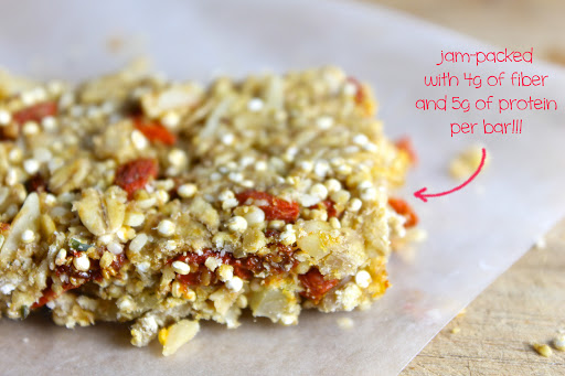 Recipes makes 10 bars approx 150 cal each with 4 grams fiber and 5 grams protein