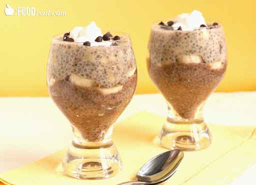 To serve divide equally between 2 bowls or glasses and layer in the following order: chocolate pudding, banana, banana pudding. Top with Greek yogurt and chocolate chips (both are optional).