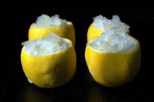 When the granita is frozen, rake until glittery. Scoop into frozen lemon shells or serving dishes.