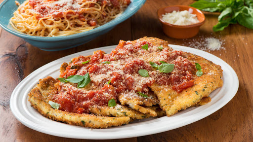 While the water is coming to a boil and the pasta cooks, coat the chicken cutlets in flour and shake off the excess; drop them in the egg and drain the excess and then coat them evenly in the breadcrumb mixture. Shallow fry the cutlets one or two at a time for 3 minutes on each side. Keep the finished cutlets warm in oven as you finish the rest.