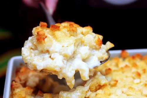 6. Pour the mixture into the prepared dish. Sprinkle the remaining 1 1/2 cups cheddar cheese, 1/2 cup Gruyère (or 1/4 cup Pecorino Romano), and the breadcrumbs over the top. Bake until golden brown, about 30 minutes (though we needed a bit more time to get it brown, but your oven may vary). Transfer the dish to a wire rack for 5 minutes; serve.