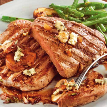 4. Meanwhile, melt the butter in a large, nonstick skillet set over medium heat. Add the mushrooms, garlic, thyme and remaining salt and pepper. Cook, stirring occasionally, for 5 minutes or until browned and tender. Stir in the balsamic vinegar. Remove from heat and stir in the parsley. Serve the steaks topped with the mushroom mixture and crumbled blue cheese.