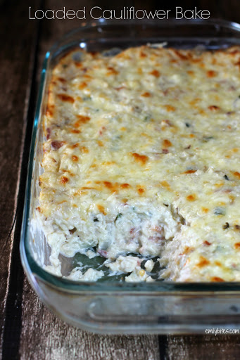 Transfer the cauliflower mixture to your reserved baking dish and top with the remaining 1 oz each of shredded cheddar and pepper jack cheeses. Bake for 30 minutes. If your cheese on top isn’t golden, turn on your broiler for 1-2 minutes until golden and bubbly.