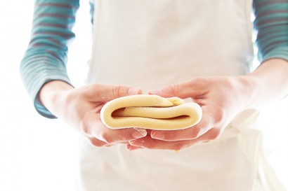 Next, make a hole in the center of the dough and pour in all of the water. Using a fork, stir to combine the dough.