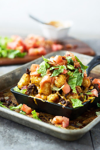 After you remove the totchos from the oven, drizzle with ketchup and may mixture. Top with tomatoes and romaine, along with more chopped bacon if desired.