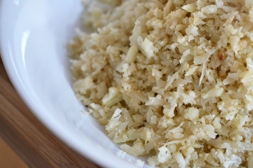Chop cauliflower into pieces large enough to fit in your food processor bowl. Pulse until the cauliflower is about the rice of a grain of rice.