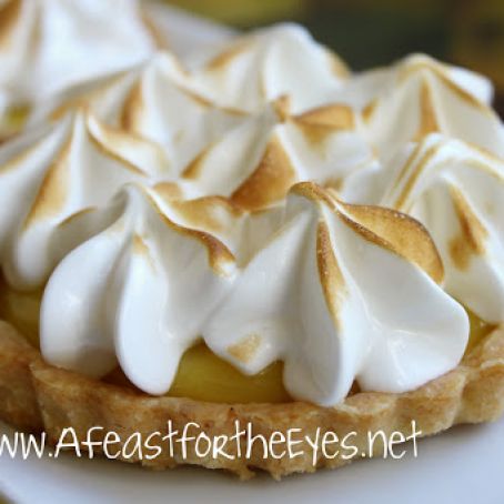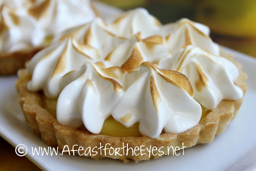 Our sweet little Meyer lemon tree generously gave us a bounty of lemons. My family loves lemon meringue pie, but I wanted to kick this up a notch. I prefer a Pâte Brisée tart crust (buttery with a sweet balance of sugar), so I decided to make tartlets. I adapted a few different Martha Stewart recipes to make a winning combination. The crust was so tender and almost like a cookie. The Meyer lemon curd had just the right balance of tartness, and the piped on meringue "stars" made these look so pretty. This can easily be adapted in an 8 or 9" tart pan. Best of all, the lemon curd can be made several days in advance, and the tarts one day ahead. Oh, and for those of you who don't like meringue-- pipe fresh whipped cream on top, instead! You can view how I made this dessert by click on the recipe source to my blog, "A Feast for the Eyes".