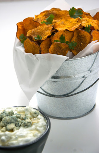 In a large bowl, toss sliced potatoes with olive oil and seasonings. Place on a parchment lined plate.