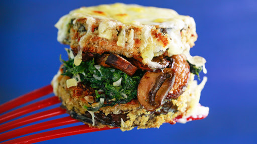 Make stacks of a slice of crispy eggplant, some spinach, mushrooms, another slice of eggplant, a dollop or two of sauce and a sprinkle each of Fontina or mozzarella and some Parmigiano-Reggiano. Arrange stacks in large shallow casserole or lasagna pan and carefully broil until tops are lightly browned and bubbly.