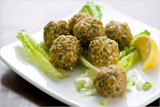 5. Moisten your hands and shape the mixture into walnut-size balls (about 1 inch). Youll have to moisten your hands again whenever the mixture begins to stick to them. Place on a platter and sprinkle with the remaining parsley. Garnish with scallions, romaine lettuce leaves and lemon wedges, and serve, or chill for several hours. Serve cold or at room temperature.