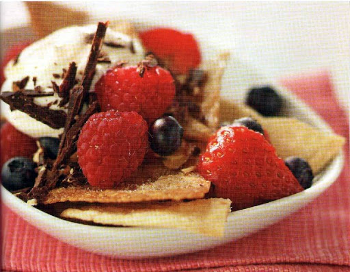 3. To serve, divide tortilla wedges among six dessert plates. Top with berries and sour cream mixture. Sprinkle with almonds and chocolate.