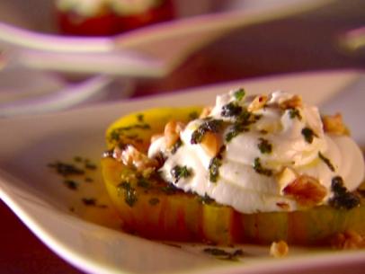 To serve: Using a serrated knife, cut the tomatoes. Top each tomato with a spoonful of the goat cheese mixture. Place a few tomatoes on a serving plate, drizzle with herb oil, and sprinkle with walnuts. Serve.