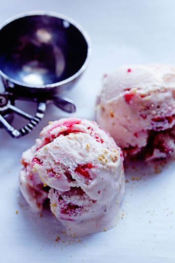 Churn the mixture in an ice cream maker according to the manufacturer's instructions. During the last minute of churning, add the remaining strawberries and the graham cracker crumbs, if using. Transfer to a freezer-safe container and freeze for at least 4 hours before serving.