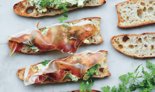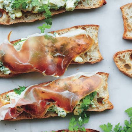 Preheat oven to 425°F. Place bread on a baking sheet and drizzle with oil. Toast until golden brown, 5 to 8 minutes. Rub with garlic. Top each toast with pickled egg salad, some chervil, and a slice of ham.