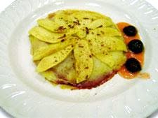 Sobre cada crepa colocar en forma de abanico circular 1 manzana en láminas. Barnizarlas con mantequilla derretida; espolvorear azúcar glass y canela. Hornear por 15 minutos. Servir una crepa por persona. Decorar con algunas moras y hojas de menta. Acompañar con coulis.