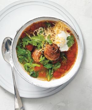 Add the broth and bring to a boil. Stir in the spinach and meatballs. Serve topped with the cilantro, Cheddar, and a dollop of sour cream.
