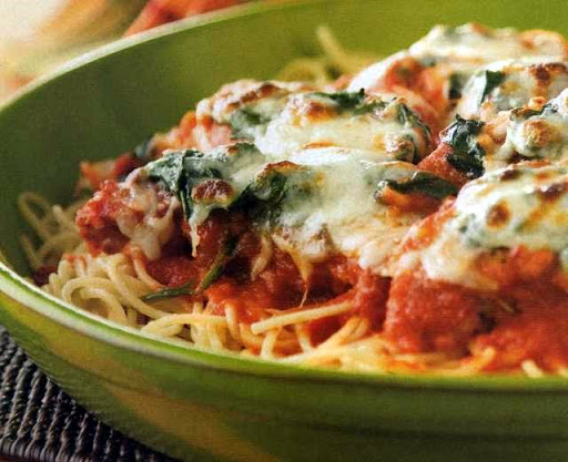 Add pasta sauce to skillet; place chicken over pasta sauce. Bring to a simmer over medium heat; reduce heat, and simmer for 5 minutes. Top each chicken tenderloin evenly with spinach. Sprinkle evenly with mozzarella cheese.