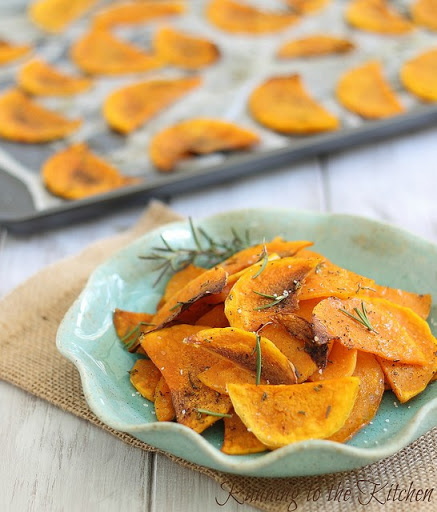 Peel squash and slice in half lengthwise. Scoop out any seeds in the base of the squash.Using a very sharp knife (or a mandolin if you have it) thinly slice the squash. The thinner, the better. Mine were probably about ⅛ of an inch thick.