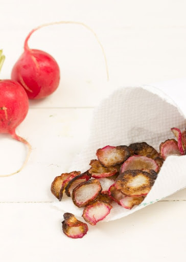 Cut the radishes into thin slices and place on a non-stick baking sheet. Drizzle the oil and place in oven.