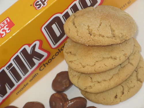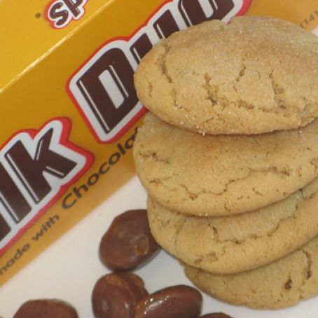 With a small cookie scoop or teaspoon, scoop cookie dough. Place a Milk Dud in the middle. Roll dough around the Milk Dud. Dip in sugar. Place on an ungreased cookie sheet.