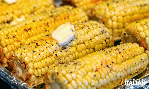 Bake for 30-45 minutes, until starting to brown. Turn corn occasionally. Remove from oven and spread remaining butter over the top of the corn. Sprinkle with more pepper as desired.