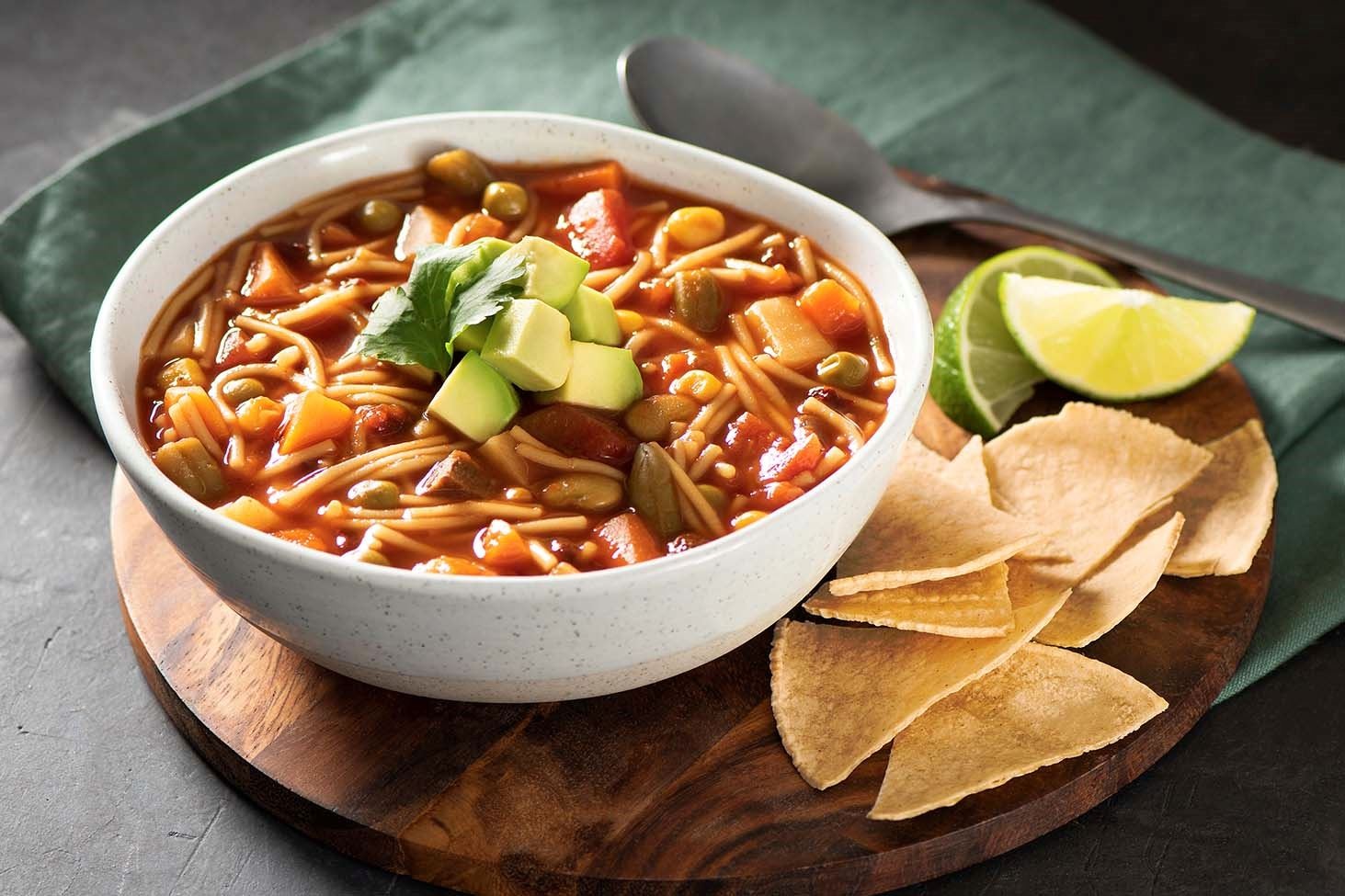 3 Add fideos and mixed vegetables. Cook, stirring often, for about 10 minutes or until noodles are tender. Ladle into soup bowls. Garnish with avocado and cilantro. Serve with toasted tortillas and lime wedges.