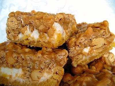 For the 3rd Layer: Melt chips, butter and corn syrup in a saucepan. Remove from heat and stir in cereal and peanuts. Pour over base and spread evenly.(I had to press mine around) Cool, cut into squares.