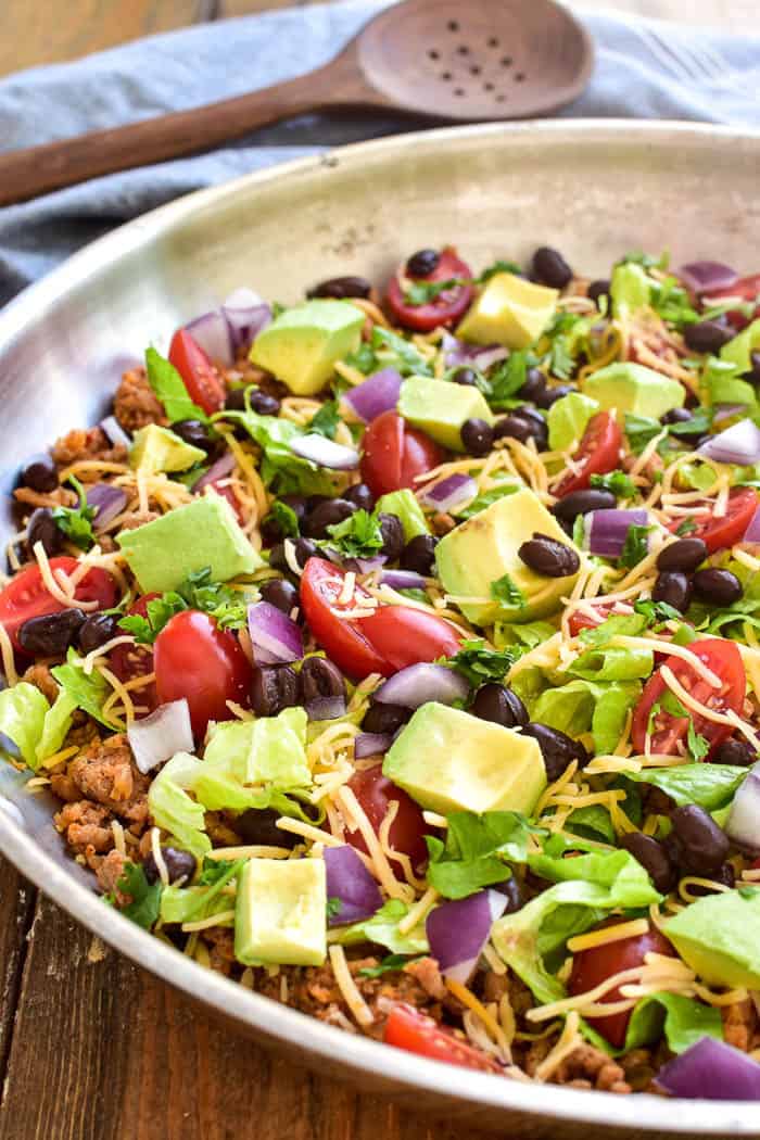 This Low Carb Taco Skillet is the ultimate healthy dinner recipe! Made with simple, fresh ingredients, this meal comes together quickly and is a delicious alternative to traditional tacos.