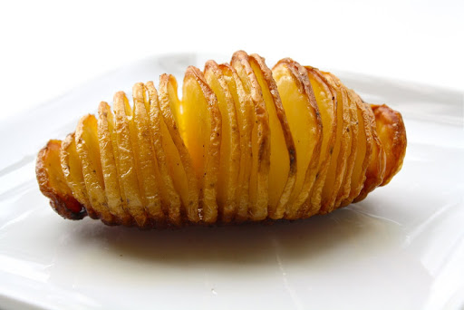 Preheat the oven to 220˚C (425˚F). Put the potato on a chopping board, flat side down. Start from one end of the potato, cut almost all the way through, at about 3 to 4 mm intervals.