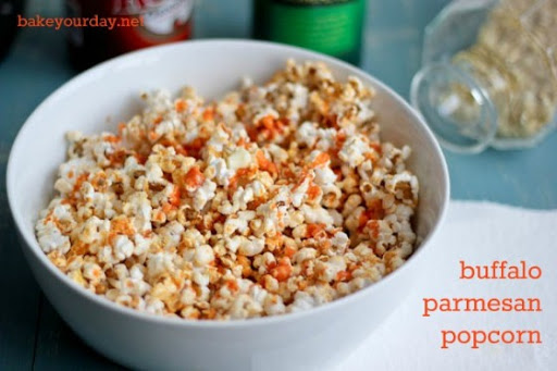 Slowly pour the mixture over the popped popcorn and toss to combine until fully distributed. Sprinkle with Parmesan cheese and toss to coat.