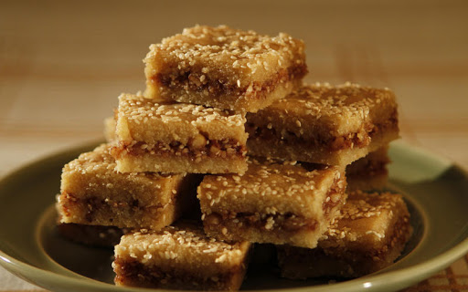 Heat the oven to 350 degrees. Grease an 8-inch or 9-inch round or square baking pan and press half of the dough evenly onto the base of the pan. Sprinkle the filling evenly over the dough, and pat it down gently into the dough. Press the remaining dough over the filling to evenly cover (this can be done with a damp spatula). Cut the dough into squares, and sprinkle the top with a light covering of sesame seeds.