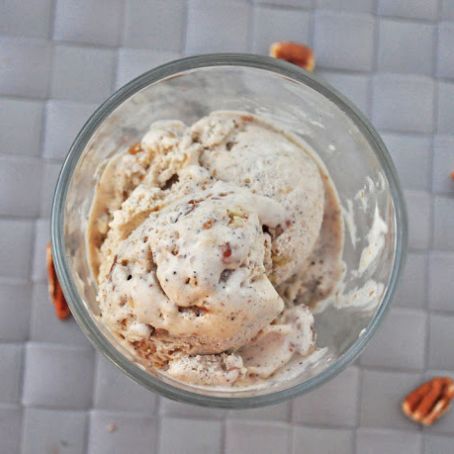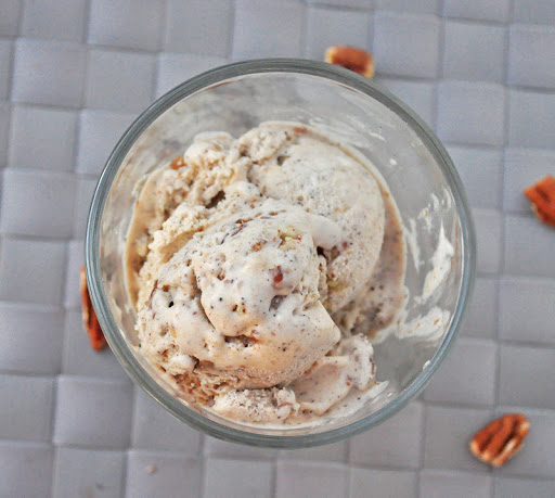 In the ice cream machine, add the ingredients for the ice cream, except the pecans and turn on the machine.