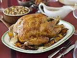 Remove from the oven, turn, and baste with 1/2 cup stock. Continue roasting with the breast side up until an instant-read meat thermometer registers 165 degrees F when inserted into the largest section of thigh (avoiding the bone), about 2 3/4 to 3 hours total cooking time. Baste the turkey once every hour with 1/2 to 3/4 cup chicken or turkey stock.