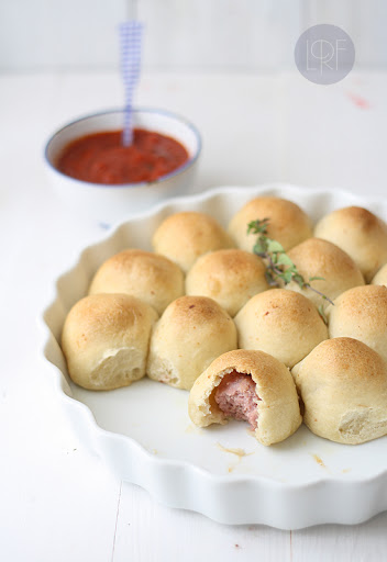 Place a meatball on each dough portion, take the sides of the dough and close it around the meatball forming a ball