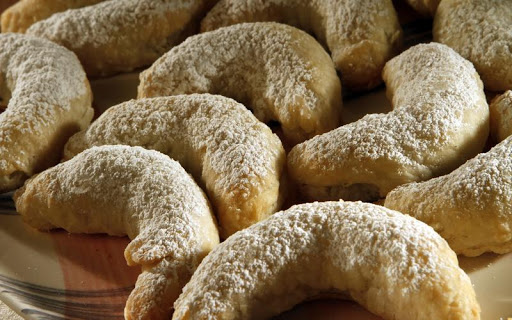 Heat the oven to 400 degrees. Roll out the balls on a well-floured board to make 4-by-3-inch rectangles. Take a generous teaspoon of the nut mixture and form it into a pencil-shaped log, almost the length of the cookie dough. Place it along the edge of one of the wide sides of a rectangle and roll up the pastry around it. Form the pastry into a crescent shape and turn the ends under, sealing them closed. Continue this way until all balls are made into crescents. The balls should remain cool. Should they become warm, keep them in the refrigerator until you are ready to make the next ball.