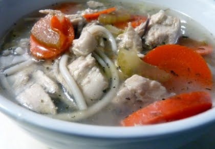 Return soup kettle to medium-high heat. Add reserved chicken fat. Add remaining onion, along with carrot and celery. Saute until softened, about 5 minutes. Add thyme, broth and shredded chicken. Simmer until vegetables are tender and flavors meld, 10 to 15 minutes.