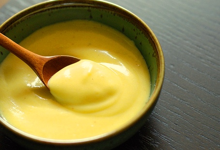 Now add the warmed vinegar or lemon juice. Remove the double boiler from the heat. Beat the sauce briskly with a wire whisk. Continue to beat the mixture as you slowly pour in the melted butter. Add the salt and cayenne and beat the sauce until it is thick. Serve immediately.