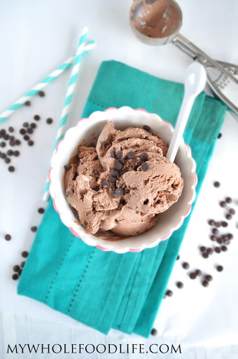 Pour into the ice cream maker and turn on. It should take about 15-20 minutes to make ice cream. When it looks like it's almost done, add the chocolate chips. Then use a spatula to guide the mixture around so they get evenly dispersed.