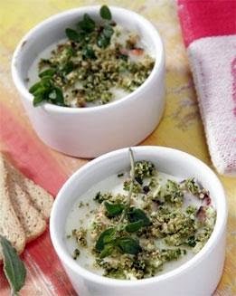 •En un mortero machacar el perejil junto con el pan y los ajos pelados y sin germen y mantequilla. Distribuir en ramiquis o cazuelitas la crema de mejillones, espolvorear con el machacado e introducir en el horno unos minutos hasta que se dore