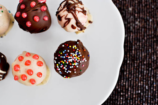 Roll in 1-inch balls and place on parchment paper laying on a sheet pan. Freeze the balls for at least 1 hour. Right before removing, melt chocolate in a double boiler or the microwave (if in the microwave, melt in 30 second increments until melted completely). Using a fork, dip balls in chocolate and gently flip it around, just until coated. Lift it out with the fork, allowing any excess chocolate to drip off. Decorate as desired, refrigerating immediately after for at least a few minutes.