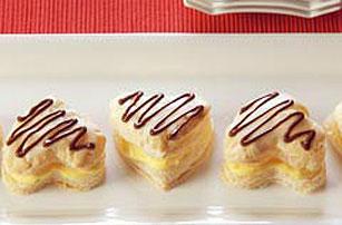 Bake on ungreased baking sheets for 20 minutes or until golden. Remove from baking sheets. Cool on racks. When pastry is completely cooled, split each heart horizontally in half. POUR half and half and liqueur into small bowl. Add pudding mix. Beat with wire whisk until well blended, 1 to 2 minutes. Chill 10 minutes.