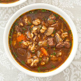 To make this soup easy and delicious, we rely on rich, meaty flavor from a well-browned fond. We start with blade steaks, which are easy to find and tenderize quickly. Adding the meat all at once is quicker than browning in batches, and after the moisture evaporates, the meat begins to color. Sautéing mushrooms, carrots, and onions in the same pan adds another layer of flavor, while soy sauce, tomato paste, and plenty of garlic deepen the flavor even more. Quick-cooking barley needs only 15 minutes of simmering.