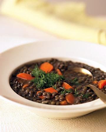 Simmer 3/4 cup French green lentils with 4 chopped carrots, 2 sliced garlic cloves, and 1/2 teaspoon sea salt in water (enough to cover by 2 inches), until tender, about 20 minutes. Stir in juice of 1 lemon, season to taste, and add about 2 tablespoons chopped fresh dill to each bowl before serving. Serves 4.