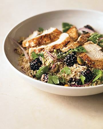 Toss cooked and cooled whole-wheat couscous with thinly sliced red onion and lemon juice. Season to taste and add toasted, shelled pistachios, fresh blackberries, and extra-virgin olive oil. Stir in basil, cilantro, or parsley leaves just before serving. Top with sliced, grilled chicken breast, lamb, pork, or tofu.