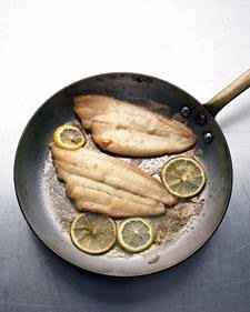 Season fish fillets, such as lemon sole, with salt; dust with Wondra flour. Melt butter in a medium skillet over medium-high heat until foamy. Add fish. Cook for 1 minute. Flip, add a few lemon slices, and cook for 1 1/2 minutes more until opaque.