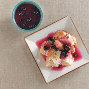 4. For syrup, in a small saucepan, mix sugar and cornstarch; stir in water until smooth. Stir in 1/4 cup blueberries. Bring to a boil; cook and stir until berries pop, about 3 minutes. Remove from heat; stir in butter, lemon juice and remaining berries. Serve warm with French toast.
