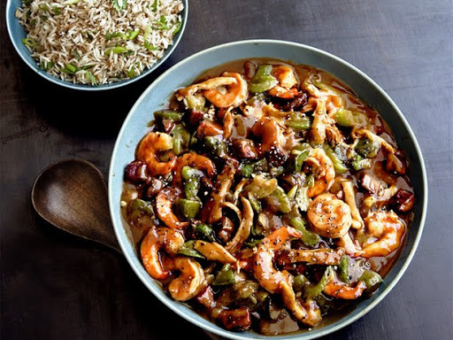Whisk in the broth. Return the chicken and andouille to the pot and simmer until the chicken is cooked through, about 25 minutes. Transfer the chicken to a plate and let cool slightly while the stew simmers; remove the skin and shred the meat. Return the meat to the pot. Stir in the shrimp and sherry and cook until the shrimp turn pink, 2 to 3 more minutes. Season with salt and black pepper.