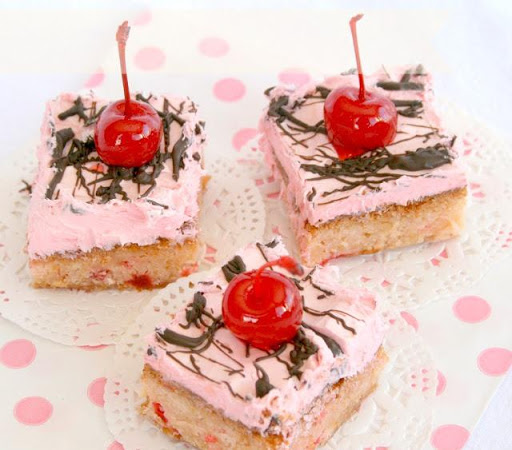 7. Let cool. Then frost with favorite icing tinted pink. Flavour icing with a little cherry juice from the jar of cherries if desired.