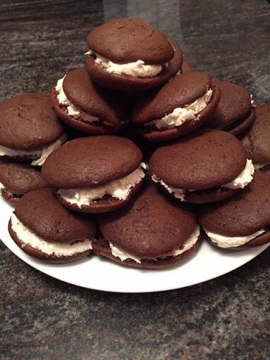 Put together Devil Dogs by spreading some filling on one of the cookies then topping with a 2nd cookie.
